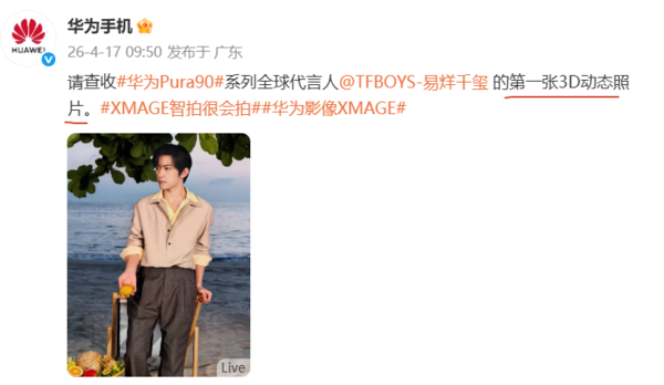 【CNMO科技消息】4月17日,华为终端通过官方微博发布了华为Pura 90系列全球代言人易烊千玺的首张3D动态照片,预告了该系列在影像技术上的全新突破。继4月14日官宣搭载2亿像素镜头开启“智拍新时代”后,华为以代言人首张3D动态照片的方式,向外界展示了Pura 90系列在XMAGE智拍与动态影像领域的进阶能力。据悉,华为Pura 90系列将于4月20日14:30正式发布。
