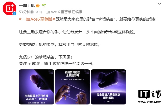 IT之家 4 月 17 日消息,一加今日宣布一加 Ace6 至尊版下周见,号称“九亿少年的梦想装备”。从预热内容来看,该机将主打游戏性能,在操控上带来不同体验。