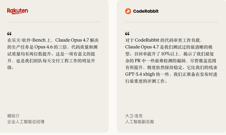 Rakuten:Opus 4.7 解决的生产任务数量是 Opus 4.6 的3 倍,代码质量和测试质量评分都有两位数提升