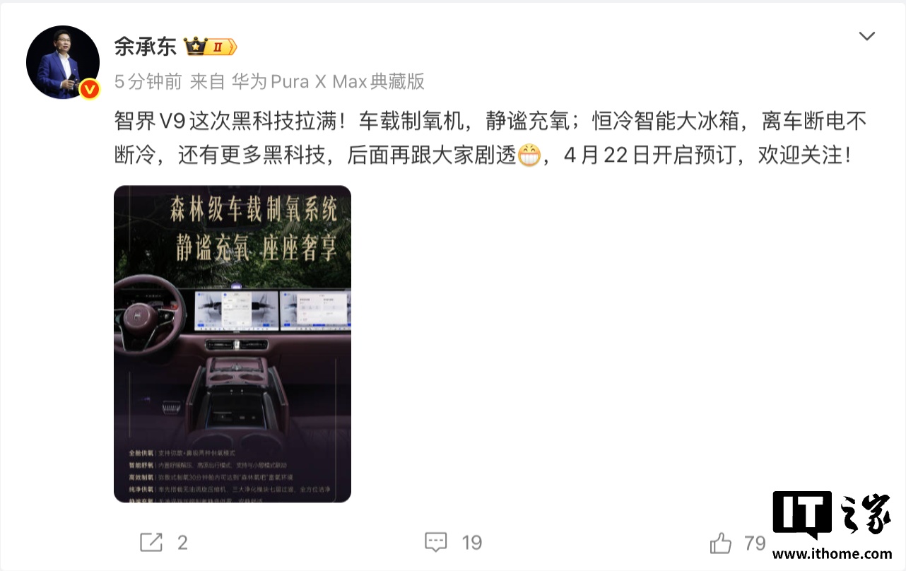 IT之家 4 月 17 日消息,今天上午,华为常务董事、产品投资委员会主任、终端 BG 董事长余承东在微博发文预热鸿蒙智行首款 MPV 车型 —— 智界 V9。