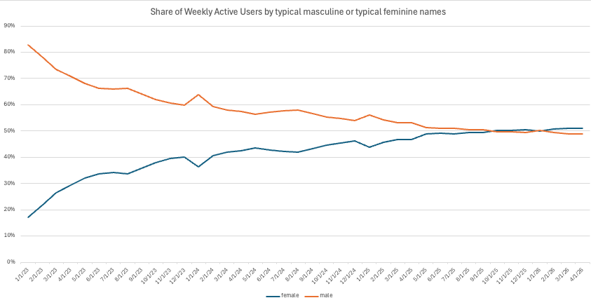 IT之家 4 月 17 日消息,OpenAI 最新公布数据显示,其 ChatGPT 用户群体结构发生历史性转变。ChatGPT 应用在 2022 年发布时,男性用户比例约为 80%,女性用户比例约为 20%;而目前女性用户已超过男性,占比超过 50%。