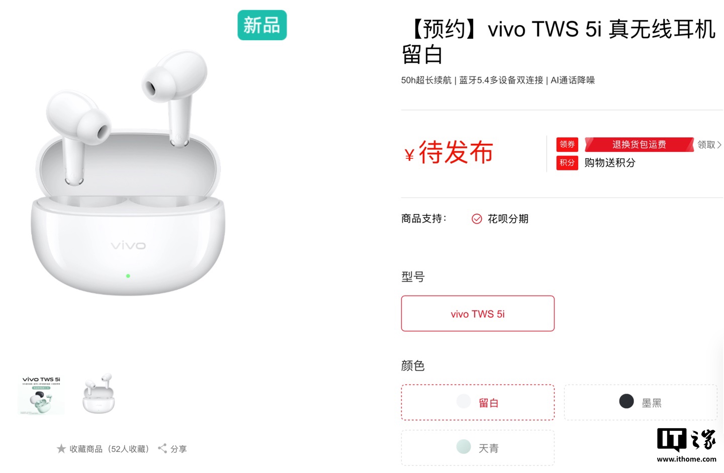 预约界面显示,这款耳机拥有留白、墨黑、天青三种颜色可选。vivo TWS 5i 耳机拥有 50h 续航,蓝牙 5.4 支持多设备双连接,此外支持 AI 通话降噪功能。