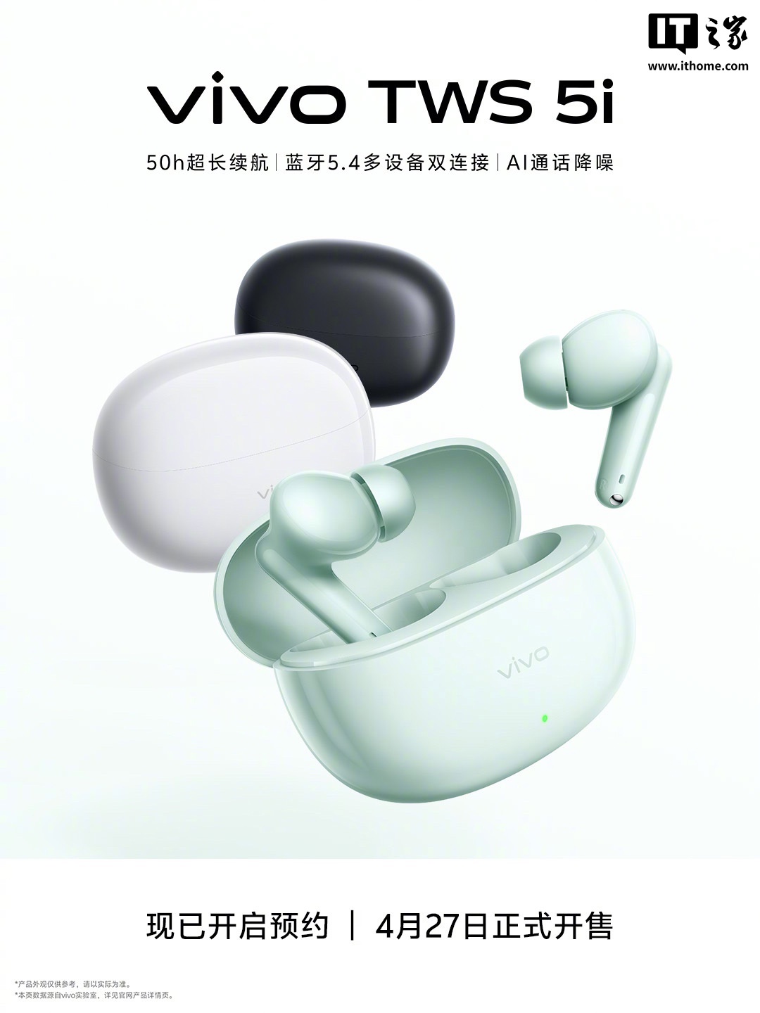 IT之家 4 月 17 日消息,vivo 官方今日宣布,vivo TWS 5i 耳机开启预约,4 月 27 日正式发售,官方暂未公布这款耳机的价格。