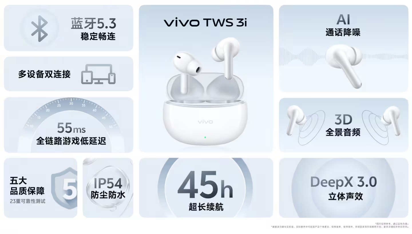 作为参考,前代产品 vivo TWS 3i 发布于 2024 年 10 月,使用蓝牙 5.3 协议,续航约 45 小时(长续航版为 50 小时),售价 99 元起: