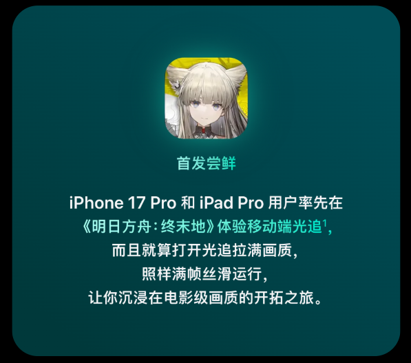 苹果官方确认,《明日方舟:终末地》的移动端硬件级光线追踪功能正式首发登陆 iPhone 17 Pro 系列及 iPad Pro 系列机型。
