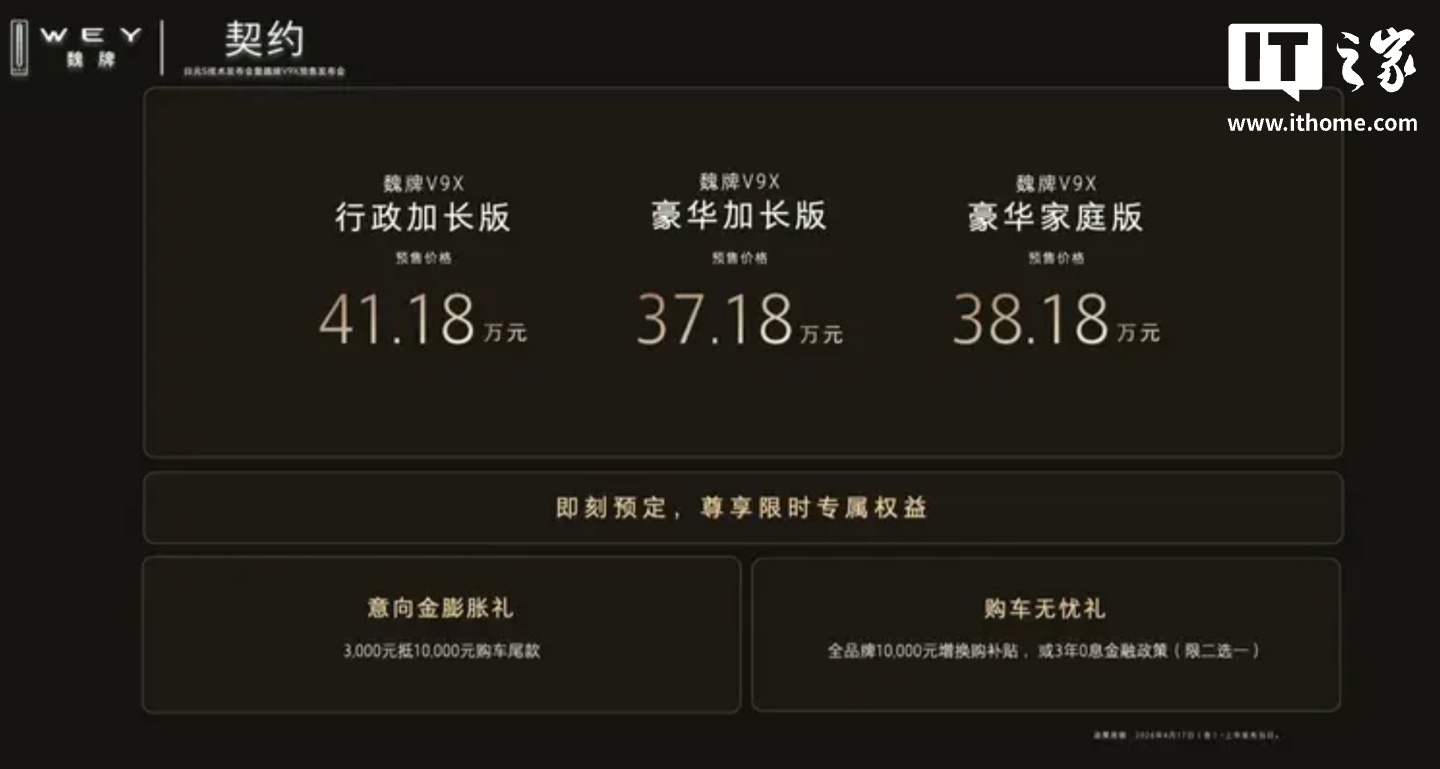 IT之家 4 月 17 日消息,长城旗下魏牌 V9X 在今天的发布会中正式开启预售,该车定位“AI 豪华六座旗舰”,搭载混动技术架构“超级 Hi4”,预售价 37.18 万元起。