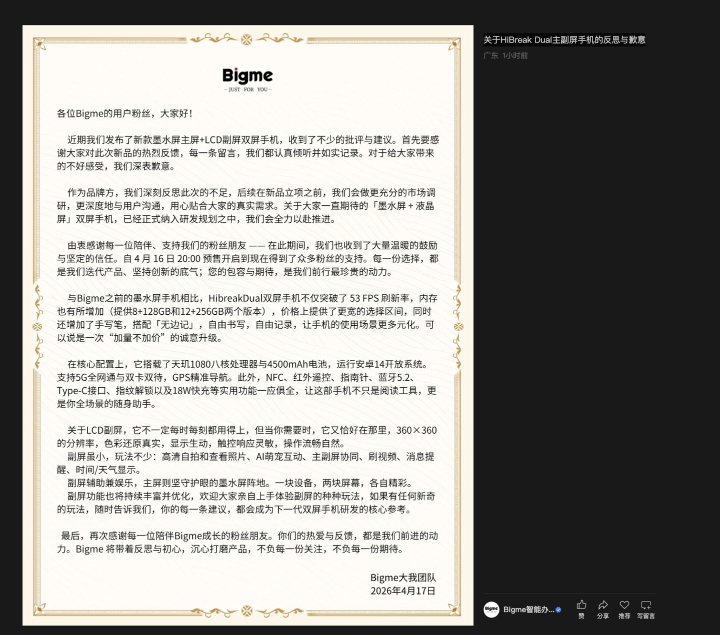 最后,再次感谢每一位陪伴 Bigme 成长的粉丝朋友。你们的热爱与反馈,都是我们前进的动力。Bigme 将带着反思与初心,沉心打磨产品,不负每一份关注,不负每一份期待。