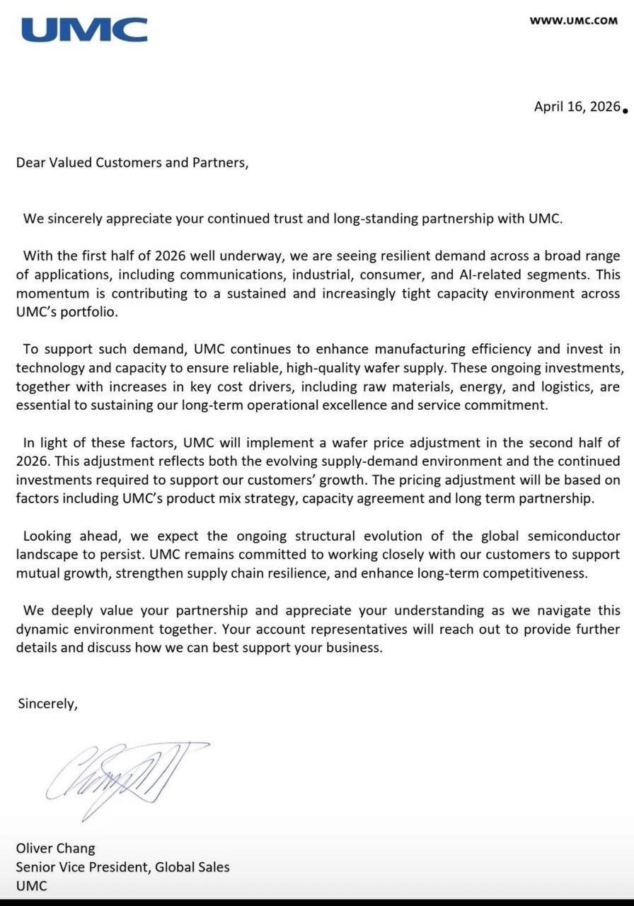 近日,联电发布涨价函,将于2026年下半年实施晶圆价格调整。联电表示,价格调整将根据联电的产品组合策略、产能协议及长期合作伙伴关系等因素而定。