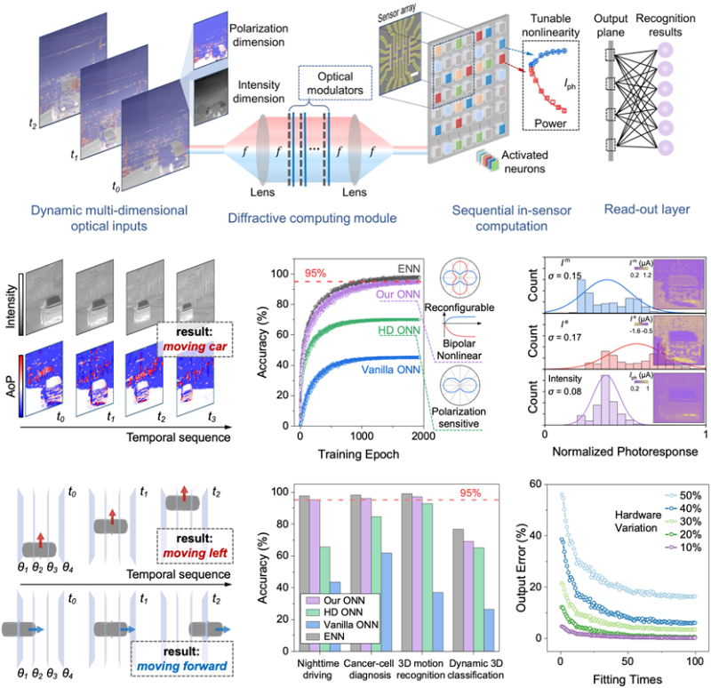 研究团队将SPU接入光神经网络前端,构建端到端混合光电视觉架构,在视野受限任务中同时处理连续帧的强度信息和偏振信息。结果表明,基于SPU的系统在目标识别性能上显著优于传统光学方案,并接近先进电子神经网络水平。夜间场景是这一能力的重要验证场景之一。