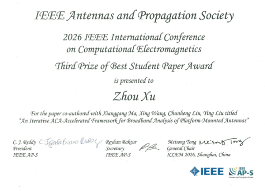西安电子科技大学雷达探测感知全国重点实验室2022级博士生徐宙投稿的论文《An Iterative ACA-Accelerated Framework for Broadband Analysis of Platform-Mounted Antennas》荣获最佳学生论文三等奖,指导教师为王兴教授和刘春恒教授。该论文提出了一种新型高低频混合宽带快速算法,实现了复杂多尺度平台阵列天线宽带辐射特性的高效分析,为机载、舰载等复杂平台阵列天线设计提供技术支撑。