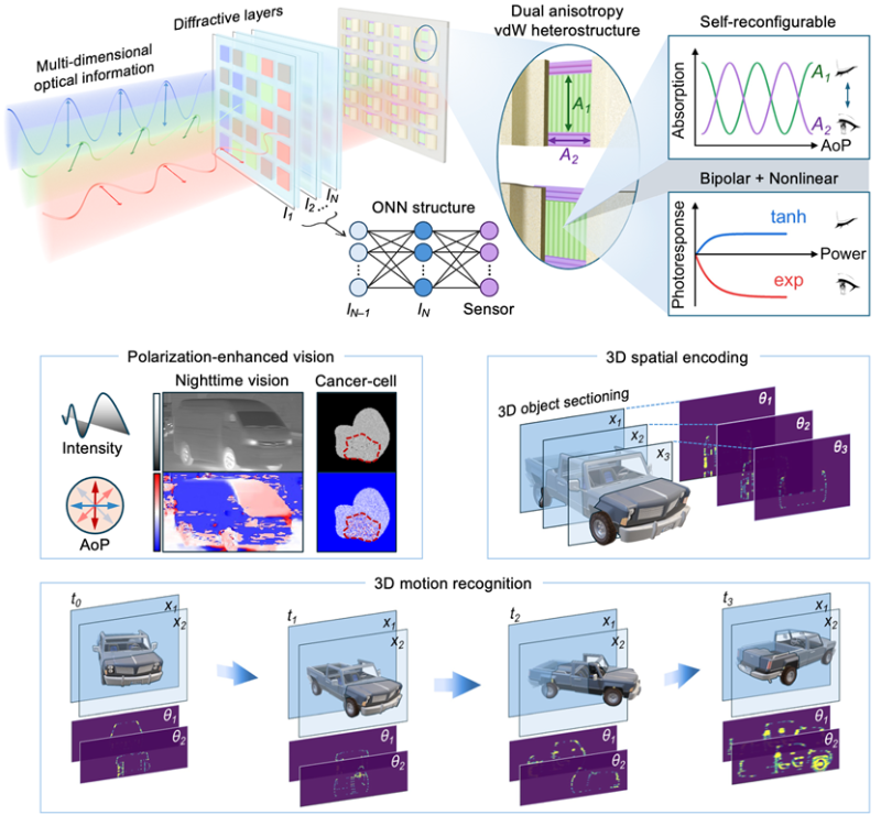 该架构将偏振敏感器件阵列集成至光学神经网络感知端,通过垂直晶格取向实现偏振维度的原生感知与可重构计算。