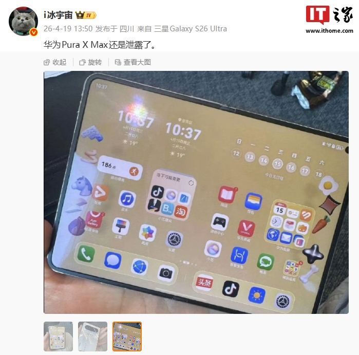 博主 @i冰宇宙 今日分享了华为 Pura X Max 的真机外观。画面显示,华为 Pura X Max 采用内外双屏设计,外屏看着与 Pura X 手机相近,展开后看着很像一台 MatePad Mini 小平板,同时内屏的折痕看着也很浅。