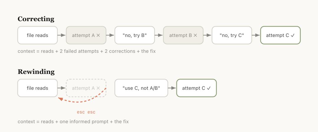 但这样做的问题是,那次失败尝试的全部中间过程还留在上下文里,继续污染后续判断。