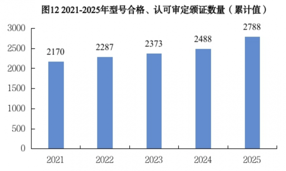 截至2025年底,型号合格和认可审定累计颁证数量为2788份(含修订)