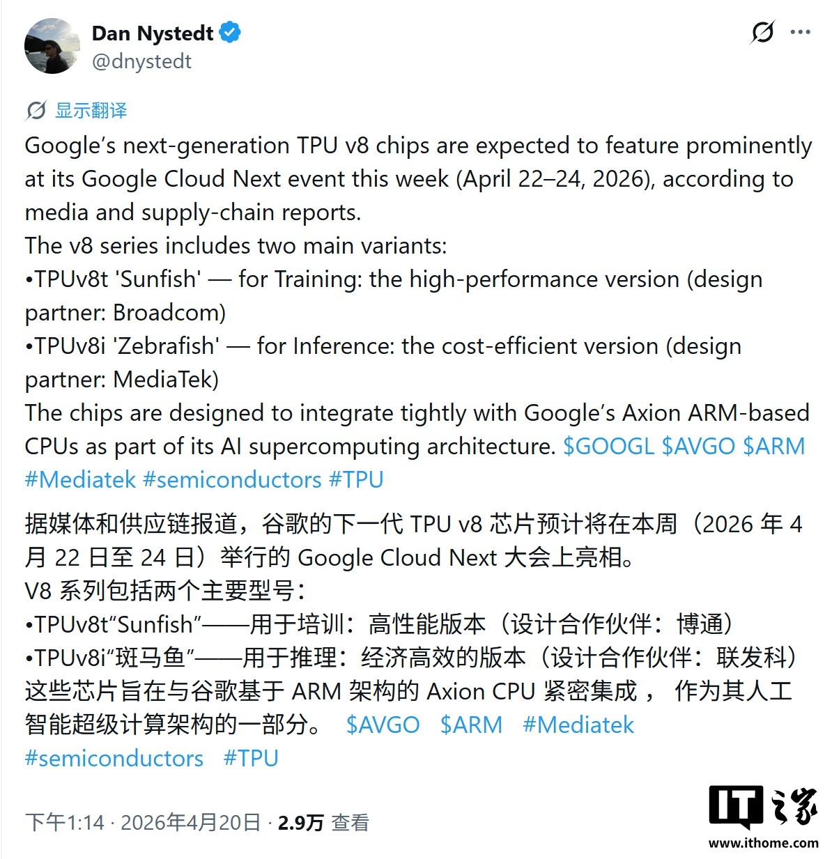 谷歌即将在 Cloud Next 活动上发布 TPUv8 系列 AI 芯片,该系列包含两款独立产品,分别针对 AI 计算的不同环节进行优化。