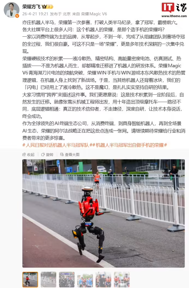 4 月 19 日,2026 北京亦庄人形机器人半程马拉松正式落幕,荣耀齐天大圣队自研的人形机器人“闪电”以 50 分 26 秒的净用时拿下赛事冠军,成为手机终端厂商中首个在该赛事夺冠的品牌。