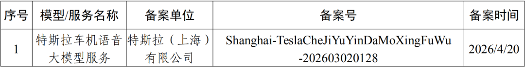 备案信息显示,特斯拉车机语音大模型服务于 4 月 20 日备案,备案单位为特斯拉(上海)有限公司。