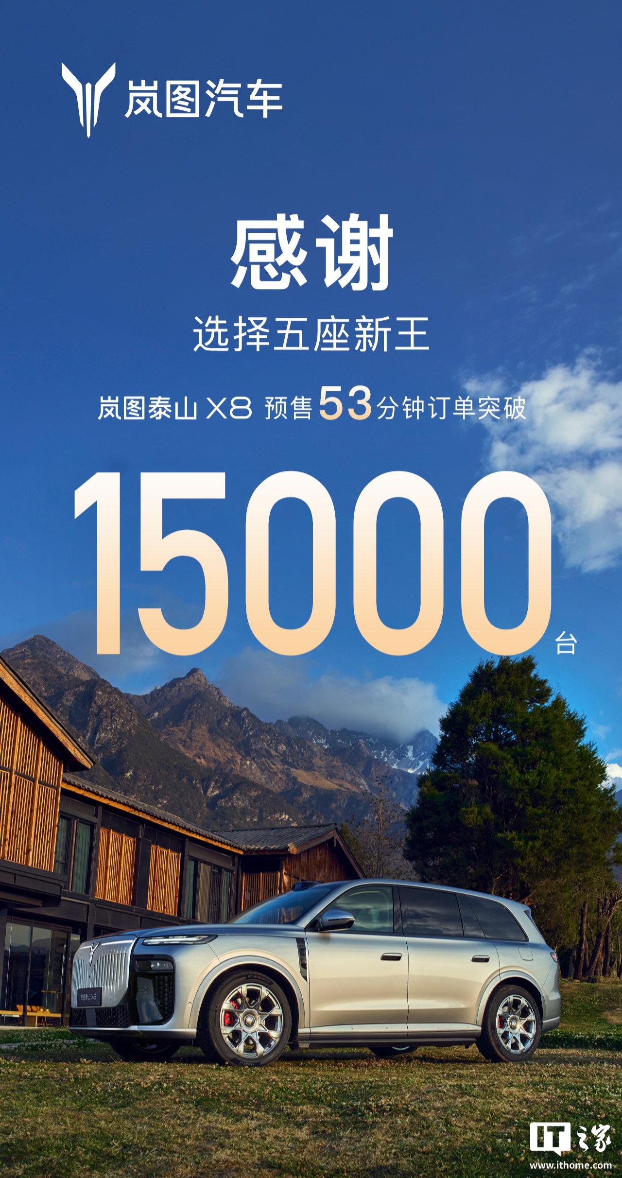 根据岚图汽车官方最新数据,岚图泰山 X8 预售 53 分钟订单突破 15000 台。
