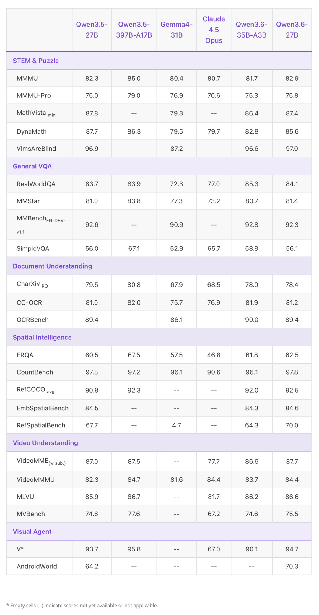 视觉语言方面,该模型原生支持多模态,能够处理图像、视频与文本的混合输入,支持视觉推理、文档理解和视觉问答等任务,其能力与 Qwen3.6-35B-A3B 保持一致。