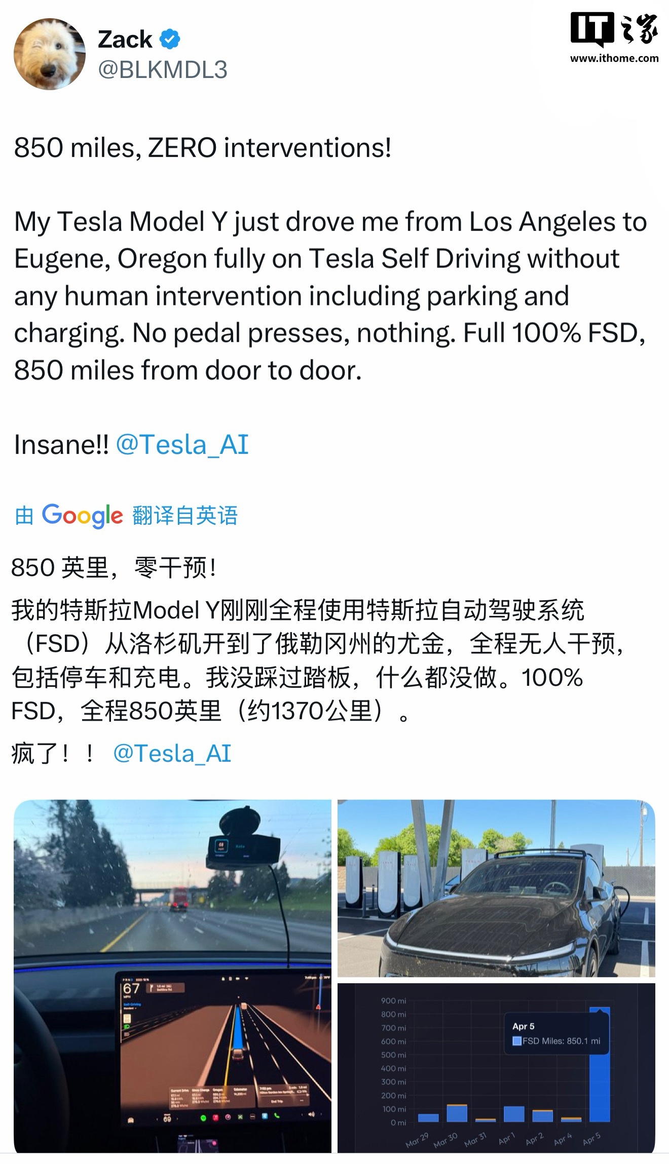 6.美国 Model Y 车主使用特斯拉辅助驾驶,从洛杉矶开到俄勒冈州尤金,行驶约 1370 公里,全程无接管,验证了特斯拉智能辅助驾驶的实用能力。