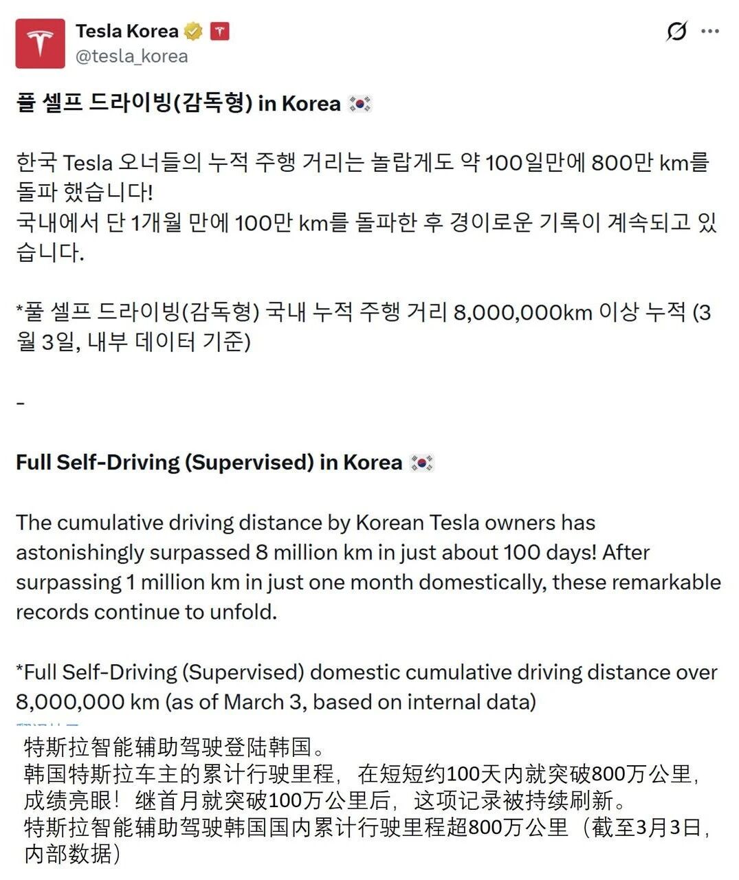 5.特斯拉智能辅助驾驶在韩国上线 100 天时间内,累计行驶里程已突破 800 万公里。据了解,该功能上线首月,当地车主行驶里程就已突破 100 万公里。