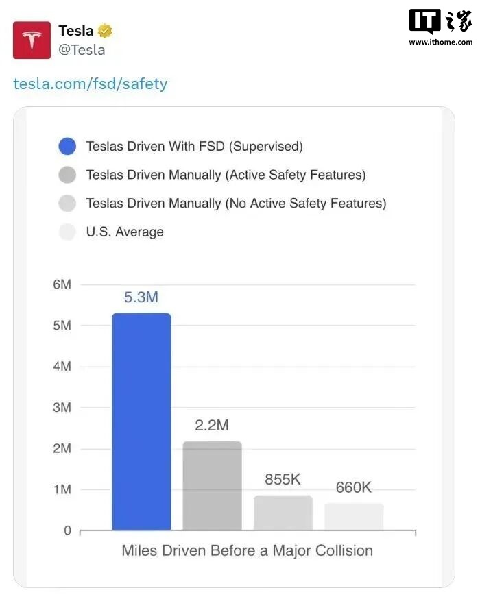 3.特斯拉最新发布的智能辅助驾驶安全报告显示,截至目前特斯拉智能辅助驾驶的累计行驶里程已突破 93.8 亿英里(约合 151 亿公里),其中城市道路场景下的行驶里程超过 33.7 亿英里(约合 54.2 亿公里)。在美国,平均每行驶 106 万公里就会发生一起重大碰撞事故;开启了智能辅助驾驶的特斯拉平均安全行驶 853 万公里才会发生一起重大碰撞事故,让行车安全水平达到美国道路平均水平的 8 倍以上。