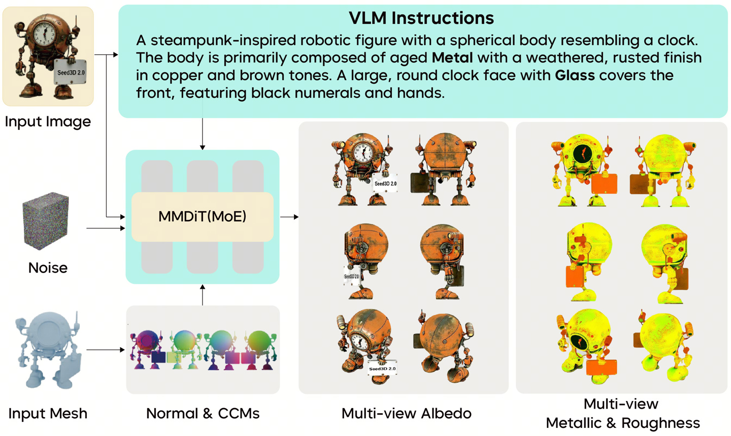 ▲ Seed3D 2.0 几何生成的完整流程同时,Seed3D 2.0 采用统一的 PBR 生成模型联合建模完整 PBR 贴图,使用 MoE 架构提升高分辨率材质细节与边界精度,并且引入 VLM 先验,增强未知光照下的材质分解稳定性与准确性。