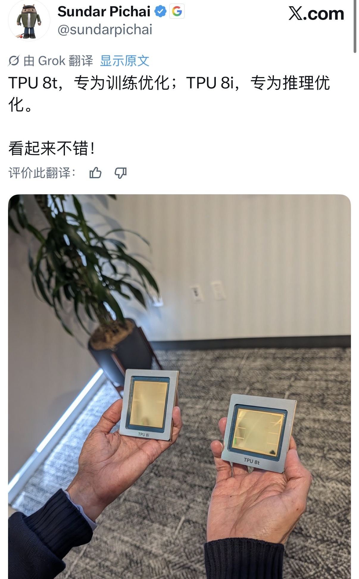 谷歌希望凭借新一代产品延续这一发展势头。在这次大会上谷歌推出了两款芯片:针对AI模型训练的TPU 8t和更适合推理任务的TPU 8i。谷歌提到,系列芯片将于今年晚些时候正式上市,并可作为谷歌 AI 超级计算机的一部分使用。