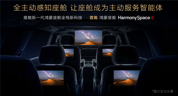 座舱内,新车首发华为双17.2英寸蝶羽双联屏,内置鸿蒙座舱HarmonySpace 6系统,搭载主动感知座舱技术,可实现语音交互、场景联动等智能体验。