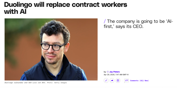 尝到甜头的多邻国,在2025年将油门一脚踩到底,进入了激进的“AI-First(AI优先)”元年。2025年4月,路易斯宣布公司转向“AI-First”,随之而来的是一套硬核的“连招”:逐步停止让承包商做AI能做的工作、在招聘中重视AI使用能力、在绩效评估里考查AI使用情况、申请增员前必须先证明工作无法被自动化。