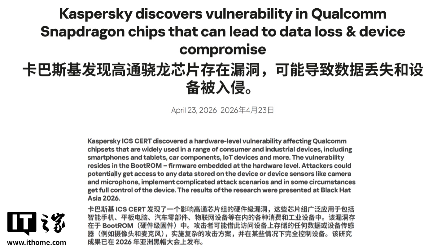 高通已于 2025 年 4 月确认该漏洞,追踪编号为 CVE-2026-25262,相关研究报告已在 Black Hat Asia 2026 上披露。