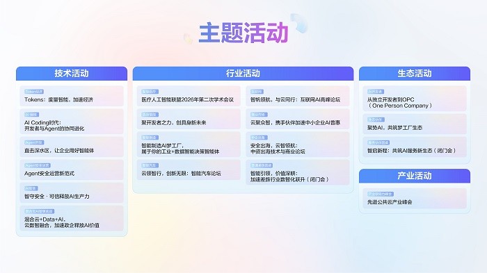 大会携手公共云产业联盟、AiDD、360、瑞金医院、CSDN等机构,举办覆盖产业、技术、行业、生态四大方向的百场论坛。产业论坛将深度探讨AI与公共云的下一跳关键发展方向;技术论坛将拆解Token经济、AI Coding、企业级Agent开发等热点;行业论坛直面智慧医疗、具身智能、智能制造、智能汽车等垂直场景的AI落地挑战;生态论坛及开放麦则让开发者与生态伙伴成为主角,分享创新实践。