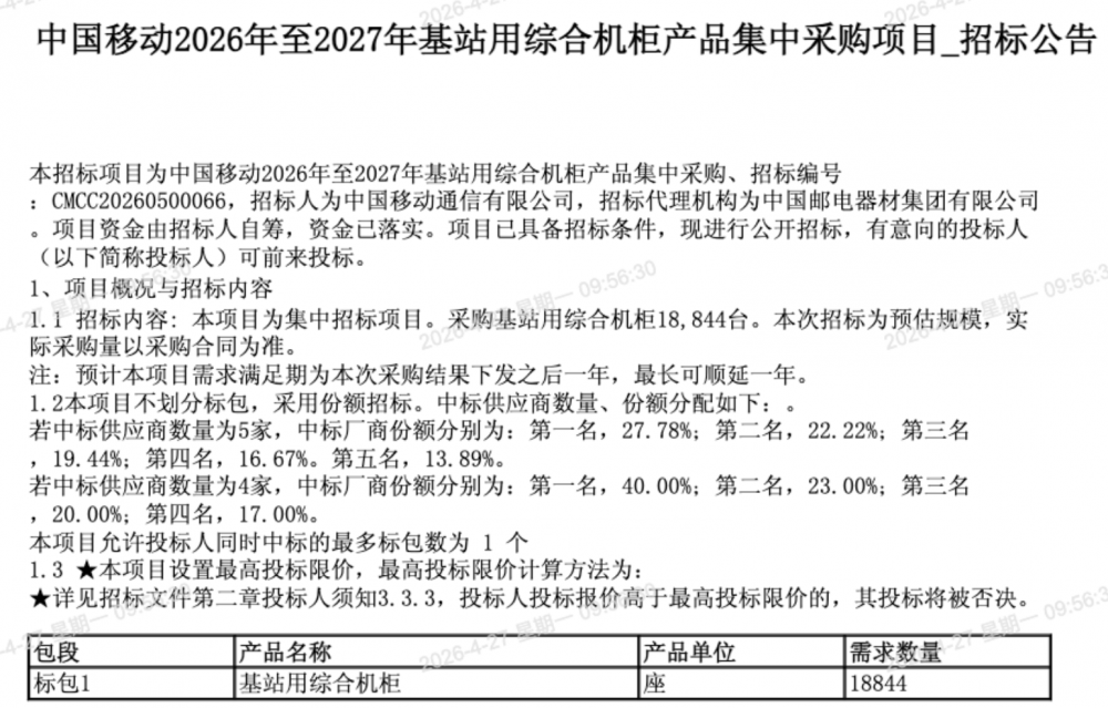 C114讯 4月27日消息(九九)中国移动采购与招标网日前发布2026年至2027年基站用综合机柜产品集中采购项目招标公告,采购基站用综合机柜18844台。预计项目需求满足期为本次采购结果下发之后一年,最长可顺延一年。