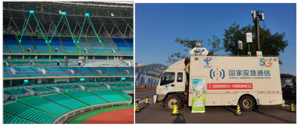 场馆内,高层部署微基站+窄波束天线,中层采用有源室分+窄波束天线,精准控覆盖、降干扰;5G采用3.3-3.5G异频组网,4G通过1.8G与2.1G异频组网,高效利用频谱。场馆外采用多载波覆盖、多频段协同,并协同部署应急通讯车,以黄金频段实现广域深度覆盖,筑牢大容量稳定底座。