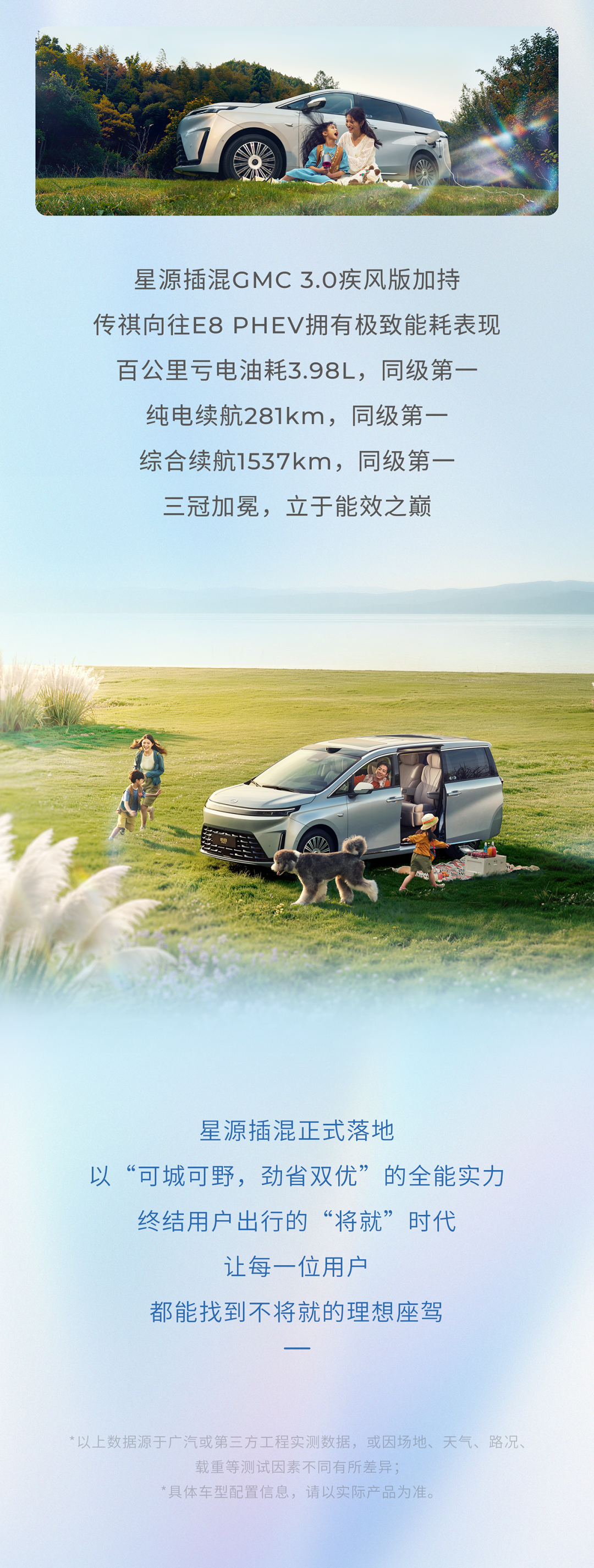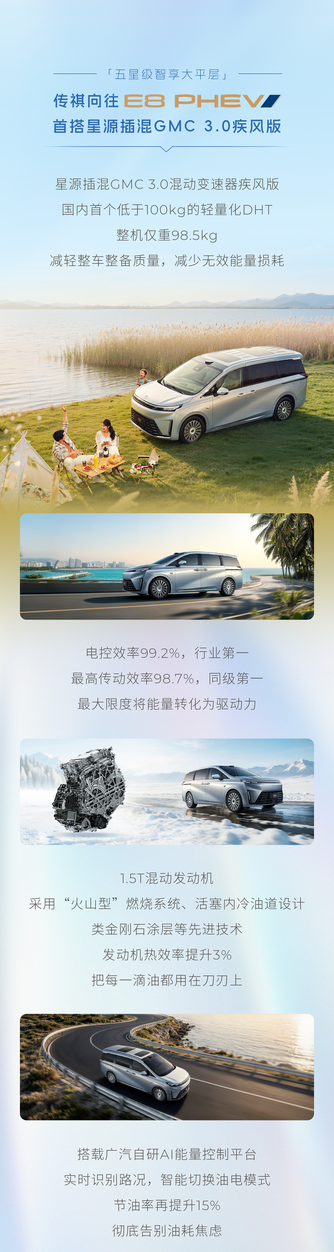 传祺向往 M8 PHEV 则首发搭载星源插混 GMC 3.0 疾风版,匹配国内首个低于 100kg 的轻量化 DHT,变速器整机仅重 98.5kg,更拥有号称行业第一的 99.2% 电控效率,以及同级第一的 98.7% 最高传动效率。