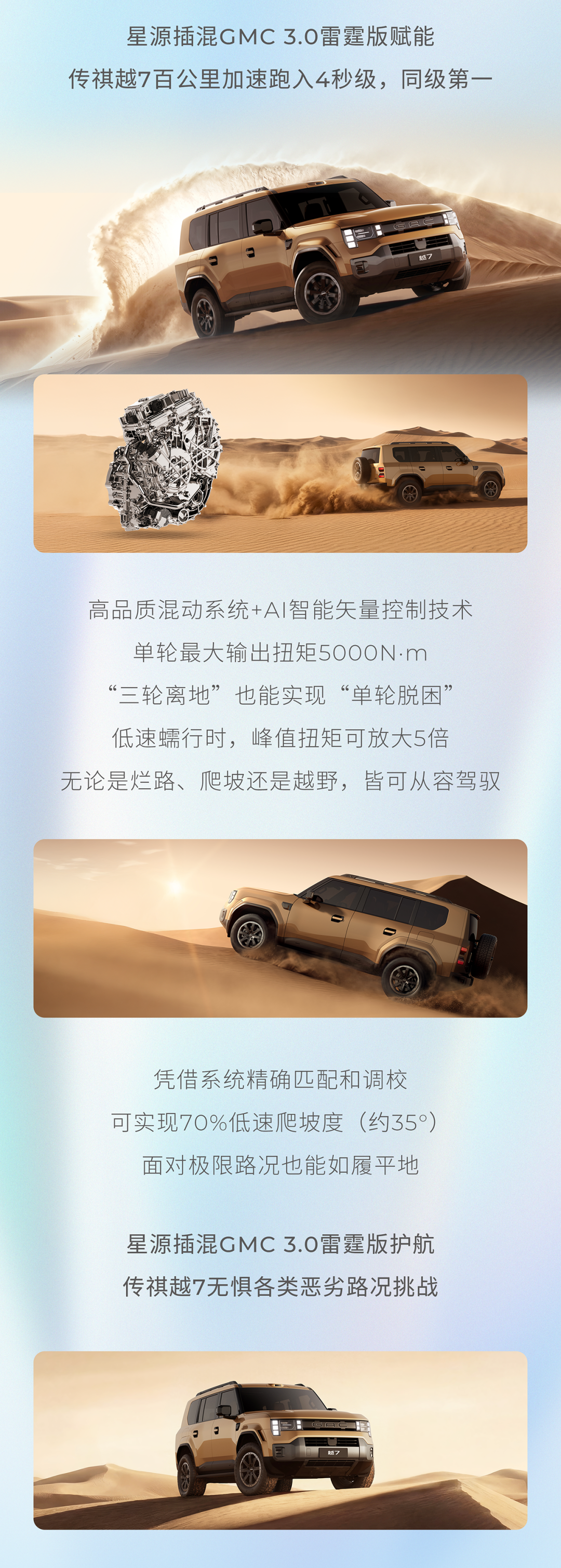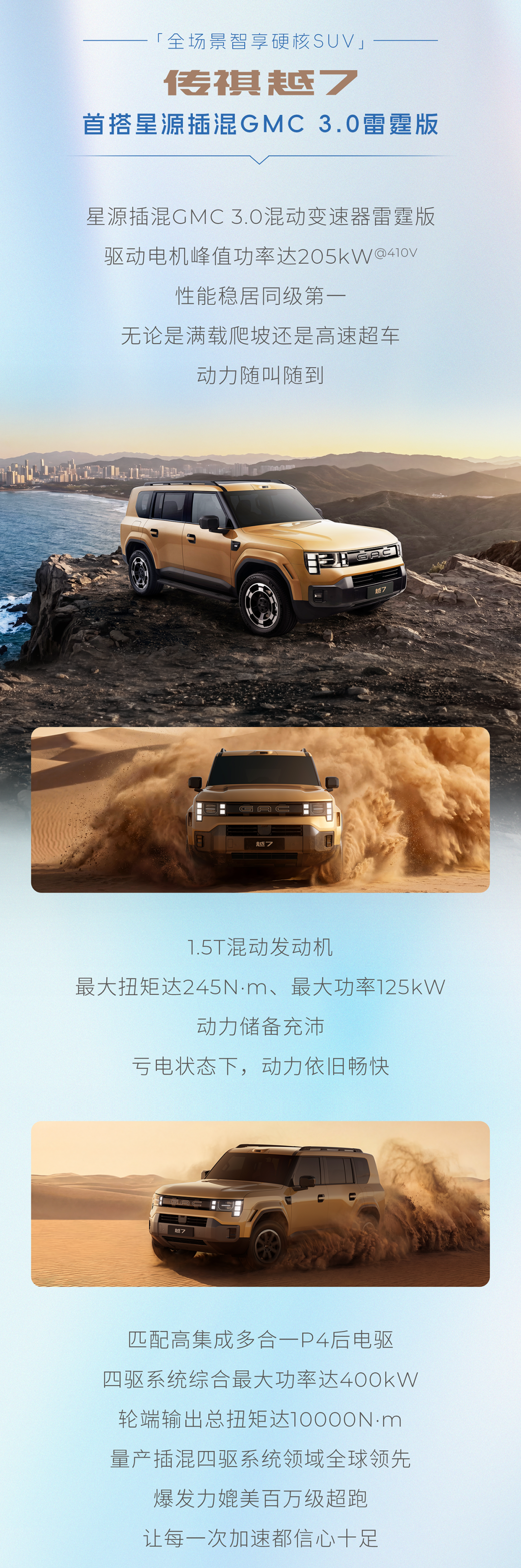 据悉,传祺越 7 首发搭载星源插混 GMC 3.0 雷霆版,驱动电机峰值功率可达 205kW,1.5T 混动发动机最大功率 125kW、峰值扭矩 245N·m,并匹配高集成多合一 P4 后电驱,使四驱系统综合最大功率 400kW,轮端输出总扭矩更达到 10000N·m,爆发力号称媲美百万级超跑。