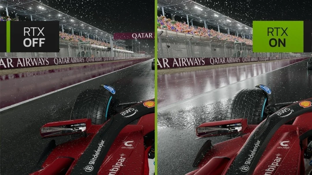 IT之家注:动态漫反射全局光照技术用于实时计算场景中的间接光照。相比传统的辐射缓存方案,DDGI 能提供更稳定的光照结构,计算效率更高,特别适合 F1 这类高速运动场景,避免了光照闪烁和性能波动问题。