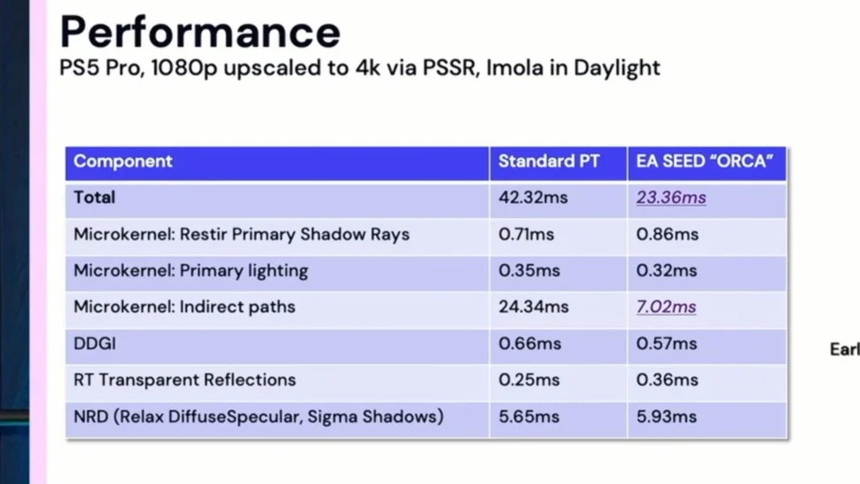 在 PS5 Pro 上演示版本采用 1080p 内部分辨率,通过 PSSR 技术提升画质至 4K 输出。早期移植版本帧时间约为 42.32 毫秒,仅相当于 24 FPS;而采用 EA Seed 研究部门的 ORCA 原型后,帧时间缩短至 23.36 毫秒,达到约 43 FPS。