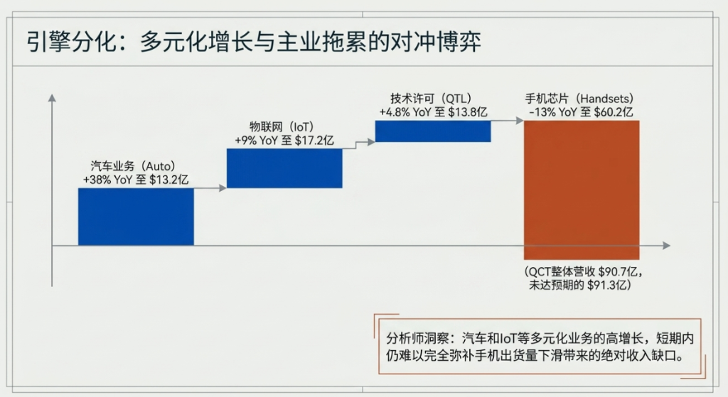 分业务来看,汽车业务营收同比增长38%至13.2亿美元,物联网(IoT)业务增长9%至17.2亿美元,技术许可(QTL)业务增长4.8%至13.8亿美元,均表现亮眼。