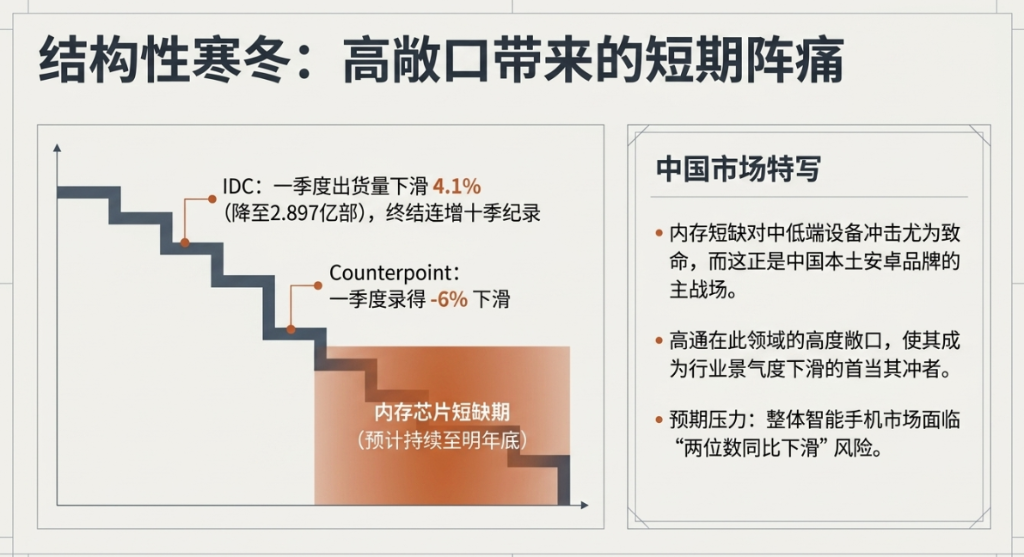 国际数据公司(IDC)亦指出,一季度出货量下滑4.1%至2.897亿部,打破了自2023年中期开始的连续十个季度增长态势,并警告称这只是2026年余下时间内更深层压力的"温和前兆"。