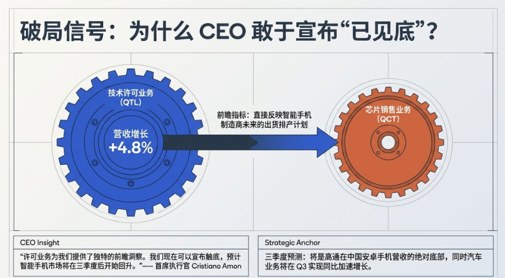 但Amon表示,公司的许可业务能够为其提供独特的前瞻洞察,因为许可收入直接反映智能手机制造商的出货计划,由此支撑其对三季度触底的判断。