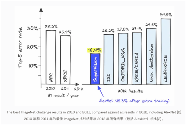 2012 年的 ImageNet 大赛上,图灵奖得主 Hinton 带领的小队打出了遥遥领先的战绩。