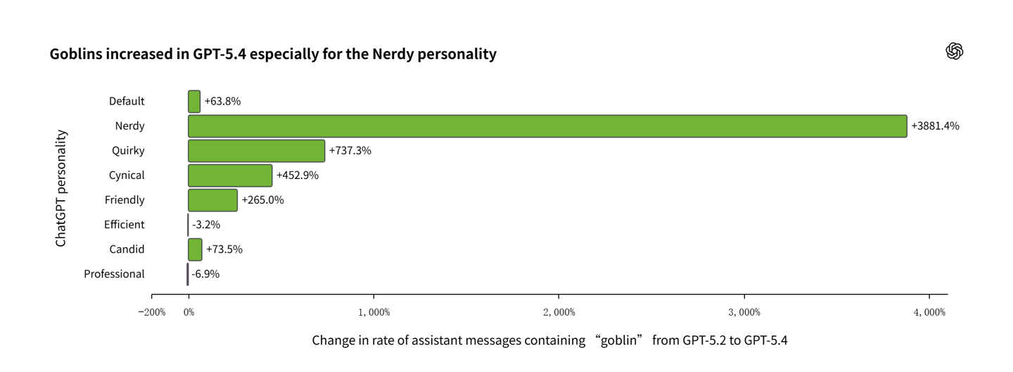 OpenAI 官方调查后发现,自从 GPT-5.1 系列发布以来,“哥布林”一词使用率上升 175%,“小魔怪”上升 52%。这一现象并非偶发,而是模型行为被特定奖励信号塑造的结果。