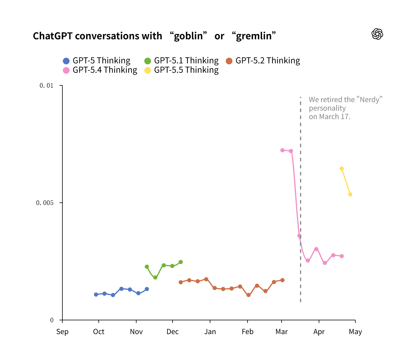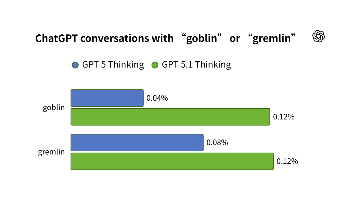 IT之家 4 月 30 日消息,OpenAI 昨日(4 月 29 日)发布博文,复盘发现 GPT-5.1 系列及后续 AI 模型出现异常行为,在回答中频繁使用“哥布林”(goblin)和“小魔怪”(gremlin)等生物隐喻。