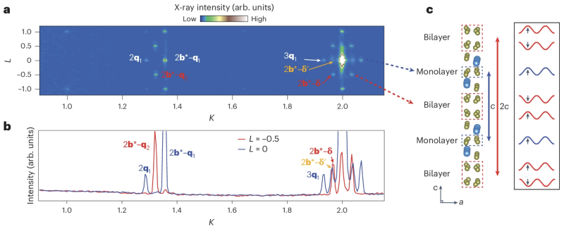 这些特征表明,堆叠在一起的非公度单层与双层电荷密度波之间存在着复杂的相互作用。然而,堆叠无序等晶体缺陷阻碍了体材料直接实验证据的获得。研究团队通过对机械剥离的超薄EuTe4薄片进行高通量、高分辨率的X射线衍射测量,成功区分出沿面外方向的晶格调制,并首次为具有不同调制矢量的单层与双层电荷密度波的共存提供了直接实验证据(图2):单层的调制矢量q1 = 0.644(5)b*,双层的调制矢量q2 = 0.678(5)b*+0.5c,其中b和c*是倒格子基矢。