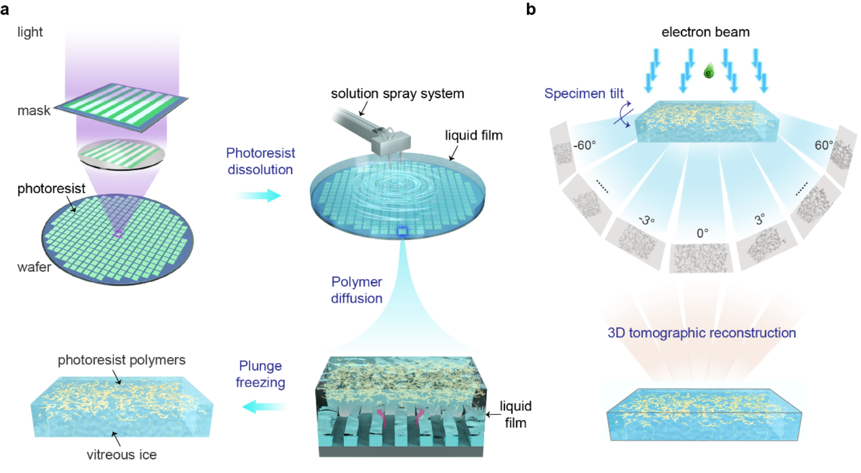 为破解这一难题,研究团队首次将冷冻电镜断层扫描(cryo-ET)技术引入到半导体领域。他们设计了一套与光刻流程紧密结合的样品制备方法:在晶圆上进行标准的光刻曝光后,将含有光刻胶聚合物的显影液快速吸取到电镜载网上,并在毫秒内将其急速冷冻至玻璃态。这种超快冷冻速度(>104 K/s)能瞬间“冻结”光刻胶在溶液中的真实构象,最大限度地保持其原生状态。