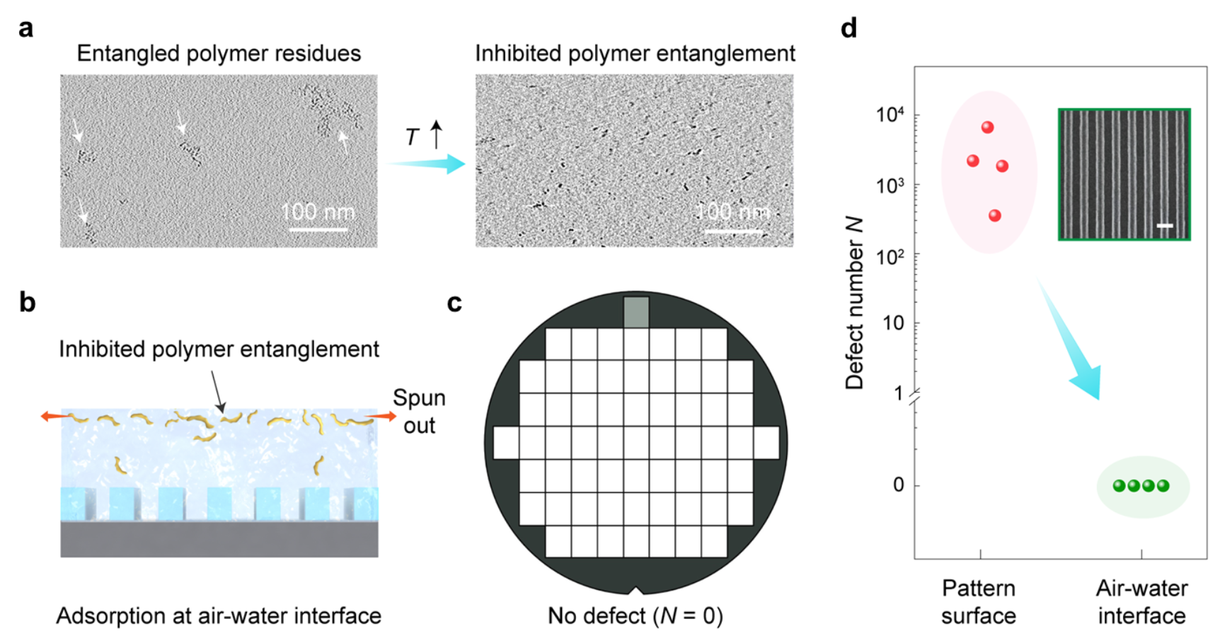 为深入理解现象背后的物理化学机制,团队进行了分子动力学(MD)模拟。模拟结果与实验观测高度吻合:光刻胶高分子会自发地扩散并吸附至气液界面,并通过弱相互作用形成“凝聚缠结”。整个过程是能量驱动的,且缠结与解缠结是一个高度动态的、可逆的过程,这为通过外部条件(如温度)控制缠结提供了理论依据。