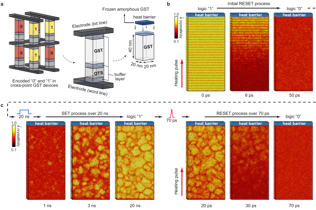商用相变存储器利用锗锑碲合金非晶相(低电导,逻辑态“0”)与晶体相(高电导,逻辑态“1”)之间的电阻差异实现数据存储。如何进一步优化器件结构与相变单元体积是相变存储芯片技术更新迭代的关键。以英特尔的“傲腾”芯片为例,其相变存储芯片单元的特征尺寸为20nm*20nm*40nm,含超53万原子,远超第一性原理分子动力学的模拟极限。模拟存储单元在纳秒级时间尺度和百万原子级空间尺度下完整读写循环一直以来都难以实现。