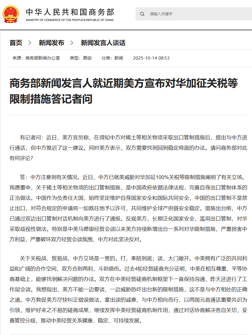 此前,中国商务部、海关总署于10月9日连发4则公告,对部分稀土设备和原辅料相关物项实施出口管制,对超硬材料相关物项实施出口管制;对锂电池和人造石墨负极材料相关物项实施出口管制;对部分中重稀土相关物项实施出口管制。随后美东时间10月10日,美方宣布针对中方采取的稀土等相关物项出口管制,将对中方加征100%关税,并对所有关键软件实施出口管制。