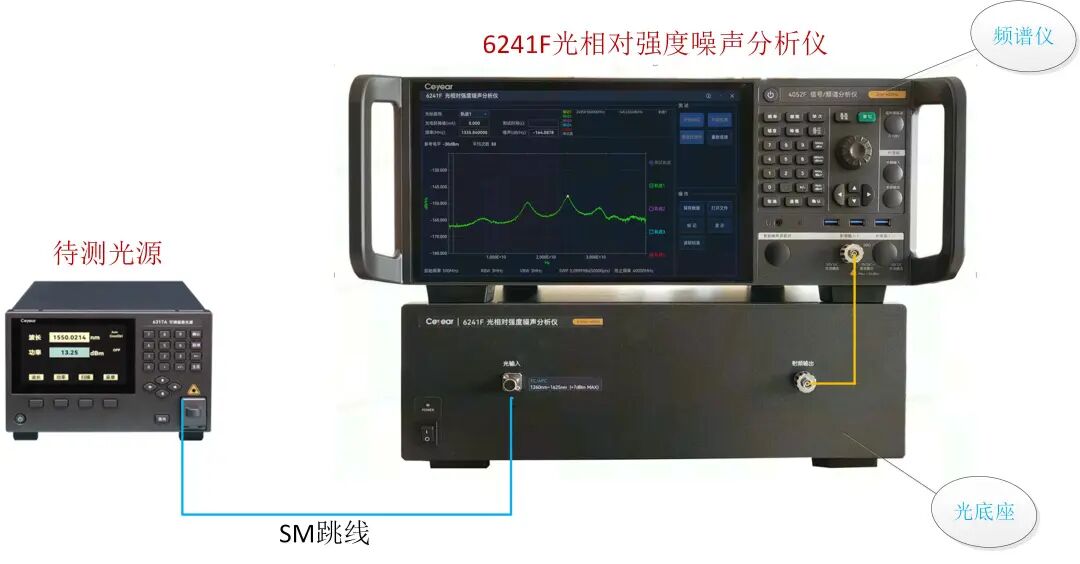 本方案由光底座和频谱仪两部分组成,为了能精准测量RIN值,“电科思仪”攻克了超宽带光电探测、多级信号处理、噪声分离及系统校准等技术难题,达到了40GHz分析带宽、-157dBc/Hz(@1mW光输入)噪底的RIN测量分析水平,同时支持1260nm~1625nm宽波段范围的RIN测量。图1为测试本公司自主研发的激光源应用案例。